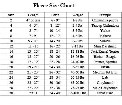 Fit : This fleece is exceptionally stretchy! Many dogs fit better one size down from their regular size. If your dog is on the smaller side of the girth measurements and not a very wide breed, we suggest sizing down.