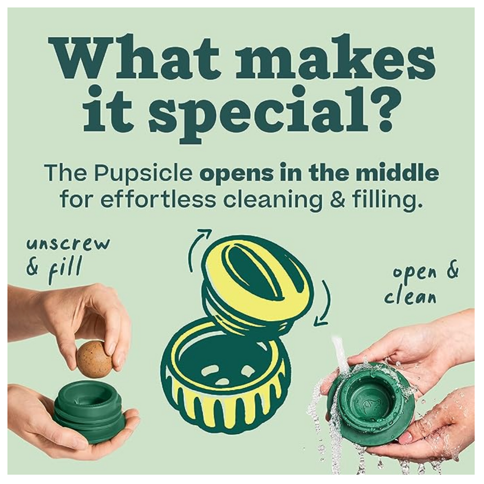 - Long-Lasting & Easy To Clean: Be sure to buy from Woof Pet to make sure you get your best friend the real Pupsicle! The Pupsicle opens in the middle for easy filling, cleaning, and reuse. To get started, unscrew the bottom, drop in a treat, and give it to your dog. They'll enjoy nutritious playtime, and you'll get 20-40 minutes of uninterrupted “me-time.” Use pre-made Pupsicle Pops for an extra long-lasting distraction or make your own treats with the DIY Treat Tray.